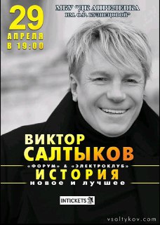 Виктор Салтыков с программой «История. Новое и лучшее» выступит Виктор Салтыков! Вас ждет потрясающее шоу, фейерверк хитов и любимых песен, которые знает вся страна: «Белая ночь», «Кони в яблоках», «Улетели листья», «Островок», «Спасибо за день» и многие другие. Этот звездный концерт с полностью живым звуком позволит вам отправиться в волнующее путешествие в мир любимой поп-музыки 1980−90-х годов. До встречи!Виктор Салтыков — советский и российский певец и музыкант, известен как сольный исполнитель и участник групп «Мануфактура», «Форум» и «Электроклуб», победитель проекта «Ты — суперстар!» в 2021 году. Продолжительность: 1 час 30 минут