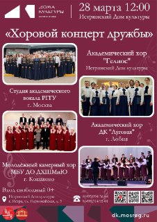 ✅ 28 марта в 12:00 в Истринском Доме культуры пройдёт «Хоровой концерт дружбы». Это событие объединит на одной сцене талантливые коллективы из разных городов, чтобы подарить зрителям незабываемые эмоции и вдохновение.
