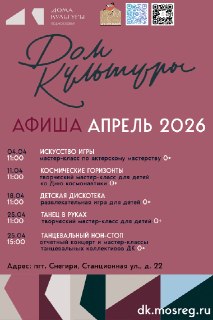 Приглашаем вас на бесплатные игровые программы и концерты для всей семьи в Снегирёвский дом культуры в апреле.