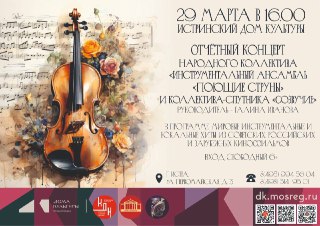 ✔️ В Истринском Доме культуры 29 марта в 16:00 пройдёт отчётный концерт народного коллектива «Инструментальный ансамбль «Поющие струны»» совместно с коллективом-спутником «Созвучие». Под управлением Галины Ивановой артисты представят зрителям насыщенную музыкальную программу, включающую любимые инструментальные композиции и вокальные хиты из отечественных и зарубежных фильмов разных эпох.