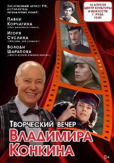 10 апреля в Рузе состоится встреча с заслуженным артистом РФ, известным по фильмам «Место встречи изменить нельзя» и «Аты-баты, шли солдаты». Владимир Конкин расскажет о своей творческой жизни, поделится интересными историями о работе над ролями и ответит на вопросы зрителей.